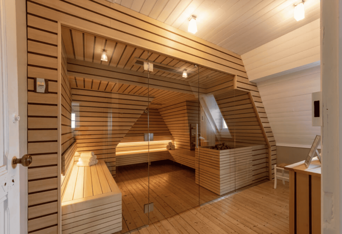 Au deuxième étage, le sauna conçu sur mesure en épousant la charpente du manoir accueille jusqu’à 8 personnes simultanément. C’est l’endroit rêvé pour se réchauffer après une balade en mer ou une session de kayak. Peignoirs et serviettes sont mis à disposition.